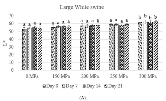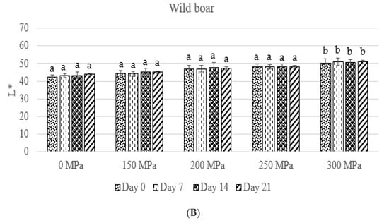 The effect of high hydrostatic pressure treatment on perceptual lightness (L*). Different superscript letters on the bars indicate significant differences. (A) Large White swine. (B) Wild boar.