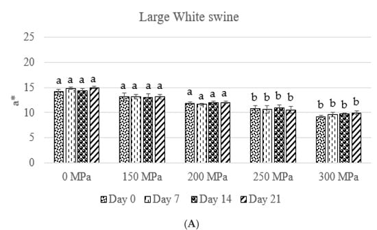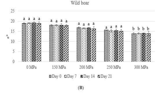 The effect of high hydrostatic pressure treatment on red/green opponent colors (a*). Different superscript letters on the bars indicate significant differences. (A) Large White swine. (B) Wild boar.
