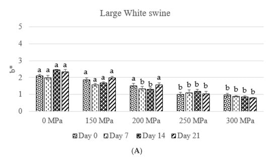 The effect of high hydrostatic pressure treatment on yellow/blue component (b*). Different superscript letters on the bars indicate significant differences. (A) Large White swine. (B) Wild boar.