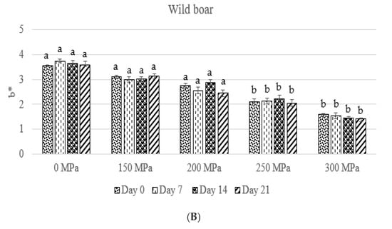 High hydrostatic pressure treatment proved to have a significant effect on the red/green component, but only above a certain pressure. In the case of Large White swine, samples treated at 250 and 300 MPa were found to differ significantly (p < 0.05) from the not treated ones. In the case of wild boar meat, a significant difference (p < 0.05) was only experienced at 300 MPa. The results showed that the storage time did not affect significantly the a* values (Large White swine: p = 0.237, wild boar: p = 0.194). The interaction effect between the treatment and time was also not significant in either the case of pork (p = 0.174) or in the case of wild boar (p = 0.152).