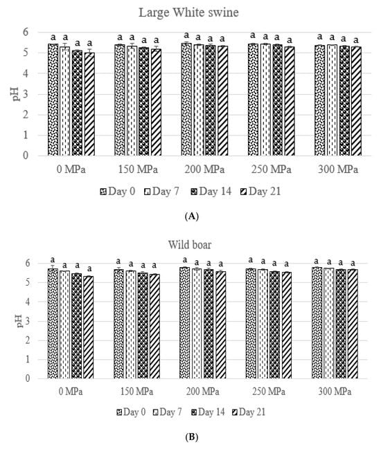 The effect of high hydrostatic pressure treatment on the pH of the Large White swine and wild boar samples. Different superscript letters on the bars indicate significant differences. (A) Large White swine. (B) Wild boar.