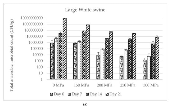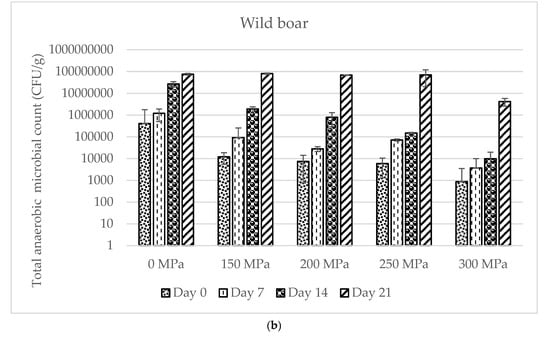 The effect of high hydrostatic pressure treatment on the total viable anaerobic microbial count of the Large White swine and wild boar samples. (a) Large White swine. (b) Wild boar.