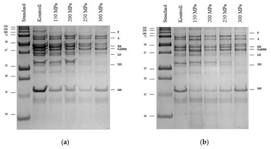 High hydrostatic pressure significantly impacts the structural and functional properties of muscle proteins; aside from denaturation a change in solubility and gel formation can commonly occur [,,,]. Under pressure, sarcoplasm proteins are highly susceptible to denaturation [], and these changes can be tracked through the application of gel electrophoretic methods (SDS-PAGE and native-PAGE) [].