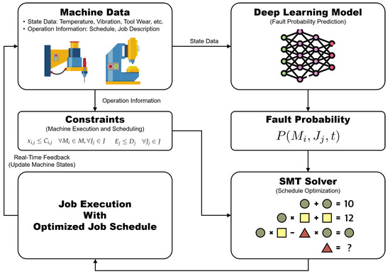 Wahid et al. [15] introduced a hybrid CNN–LSTM framework for predictive maintenance, leveraging time series data to anticipate machine failures in Industry 4.0 settings. Ayvaz and Alpay [16] proposed a predictive maintenance system utilizing IoT data and machine learning algorithms such as Random Forest and XGBoost for real-time fault detection in manufacturing environments. Yadav et al. [17] presented a machine learning-based approach that emphasizes the comparative analysis of various models, including deep learning techniques such as LSTM, for fault prediction using real-world datasets. While these studies focus primarily on fault prediction, our research integrates fault prediction with SMT-based job scheduling optimization, enabling simultaneous fault anticipation and resource management tailored for dynamic production environments.