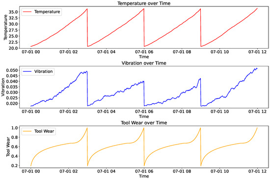 The fault probability is modeled to increase as the tool wear approaches its threshold. When a tool reaches its maximum wear level, the machine is marked as faulty and requires maintenance or tool replacement, at which point the tool wear and fault probability are reset. These phases reflect the typical lifecycle of industrial tools, as illustrated in Figure 2. For Machines A, B, and C, the data reflects their distinct operational characteristics. Machine A experiences high vibration levels due to its drilling tasks, Machine B exhibits greater tool wear with minimal vibration from threading operations, and Machine C shows longer stable wear phases and higher temperature increases, consistent with milling operations.
