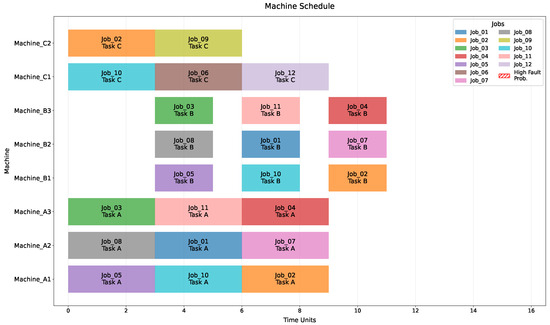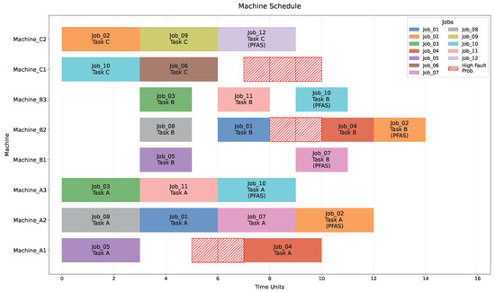The scheduling results are shown in Figure 7. The PFAS method made several key scheduling adjustments based on both priority and resource utilization considerations. In terms of priority-based decisions, Job_10 with higher priority (7) was scheduled earlier on Machine_A3, while the lower-priority Job_02 (4) was delayed to accommodate other jobs. Job_04’s tasks were strategically split between Machine_A1 and B2 to maintain scheduling efficiency. These adjustments helped to achieve balanced workload distribution across machine groups while effectively utilizing alternative machines during predicted fault periods. Throughout this process, all task precedence constraints were maintained while successfully avoiding potential faults.