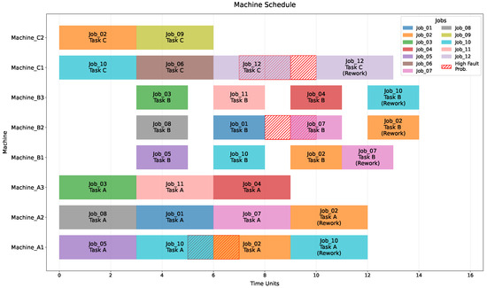 These failures triggered a cascade of scheduling disruptions. The rework requirements for Job_10 and Job_02 on Machine_A1 caused significant delays, forcing subsequent tasks to be postponed. This ripple effect particularly impacted Machine Group B’s operations, where the delayed Task B operations created resource conflicts and further scheduling complications. The situation was exacerbated by additional failures in Machine_B2 and Machine_C1, leading to multiple rework cycles that disrupted the original schedule’s efficiency. These cascading effects resulted in reduced machine utilization across all groups, with particularly significant impacts on Group B (42.9%) and Group C (57.7%), while also causing several jobs to miss their due dates.