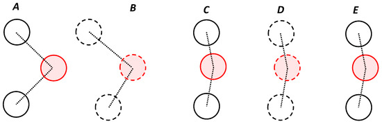 Figure 5 shows a representation of non-cooperative multi-agent systems [36] from points A to C. The leader robot is represented in red and the followers in black. The dotted lines represent the distances between the leader and the follower robots.