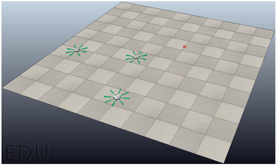 In the case of the followers, they use the position of the leader as a target point and a distance regarding their position in the formation concerning the leader. These equations help in designing the control strategy for the followers to maintain a specific formation relative to the leader. The velocity of the leader () depends on two terms (Equation (6)): which is its position error () and a control gain () that defines the importance of this error in the control. The second term () represents the sum of the position error of each follower () in the formation (Equation (7)), multiplied by a control gain (). By adjusting the control gains (, ) and desired positions, the formation can be maintained dynamically as the leader moves.