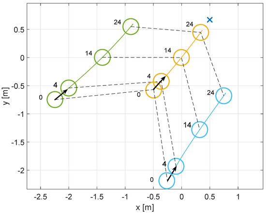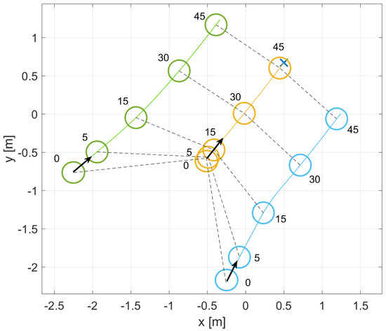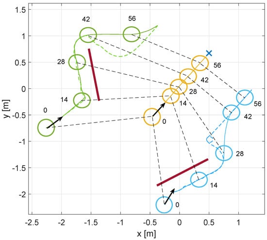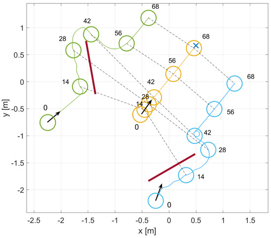 While the leader approaches the target, both followers are affected by an obstacle. Figure 14 shows the initial positions. The simulation time is around 70 s.