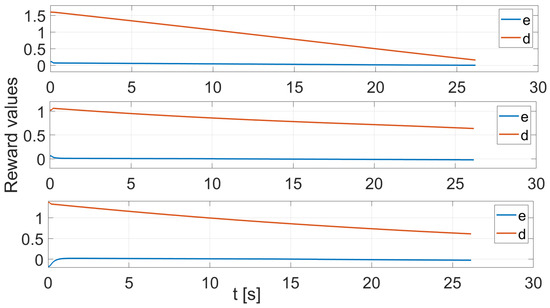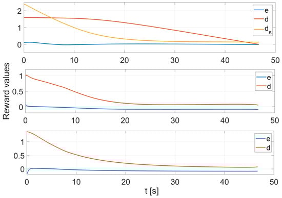 Reward values for cooperative approach with e the orientation error, d the distance error, and the added followers’ distance errors. Leader: up, follower 1: centre, follower 2: bottom.