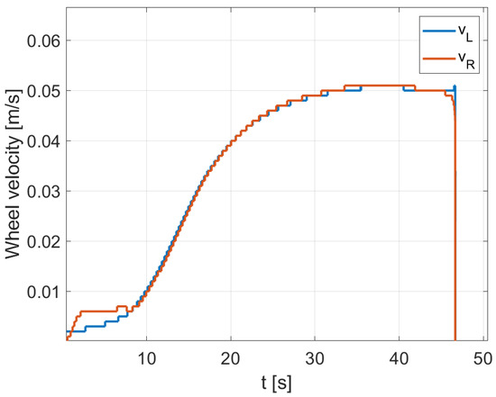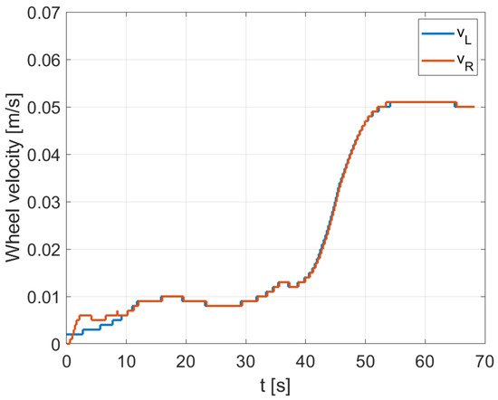 A differential wheeled robot is a mobile vehicle that moves using two independently driven wheels located on either side of its body. The tangential velocities of these wheels denoted as () and (), left and right, respectively, are perpendicular to the axis of the wheels. The wheels are assumed to roll without sliding, a restriction known as non-holonomic [27]. The robot changes direction by the differential rotation of the wheels, eliminating the need for an additional steering mechanism. The robot’s kinematic model in Cartesian coordinates is described as follows [23,28]: