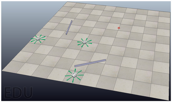 CoppeliaSim simulator (formerly V-REP) [25] is a useful tool for the development of 3D simulations, based on high-fidelity physics-based models. As an integrated development environment (IDE), it allows for a distributed control architecture where each object/model can be individually controlled using embedded scripts, plug-ins, remote application program interface (API) clients, Robot Operating System (ROS) nodes, or custom solutions. On the other hand, control algorithms can be written in several programming languages, including Lua, C/C++, Python, MATLAB, Java, and others. The simulator offers numerous examples like robot models, sensors, and actuators to create and interact in a virtual world in real-time. Additionally, it allows for adding new objects with dynamic properties for designing and constructing new robots. In particular, a model for the Khepera IV robot has already been put together and developed for the CoppeliaSim simulator. In previous works [26] (see Figure 1), the authors developed a library to include the Khepera IV robot model in CoppeliaSim. In this work, the model of the Khepera IV is used to test the experiments in the CoppeliaSim environment.