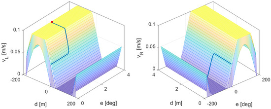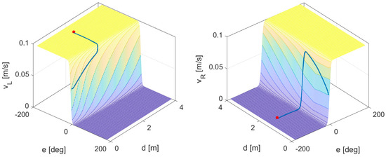 In this case, single robots start with similar initial conditions, and orientations as opposed to a target point, and execute their algorithm based on their errors. As the controllers, DRL and Villela, were designed with two inputs (such as followers’ controllers), orientation error e, and distance error d, a graphical representation is possible. Figure 18 and Figure 19 show their control surfaces and the trajectory the robot took. Figure 20 shows the trajectories in the horizontal plane. These results confirm previous ones obtained by the authors, where a Q-learning controller was applied to the robot outperforming other classical controllers [19]. These results show a better performance for the DRL. In general, the goodness of DRL becomes more apparent for more complex systems, involving more signals and more involved dynamics.