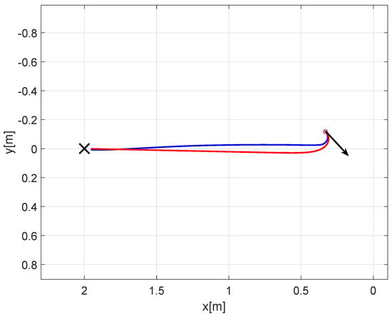 Position histories in the horizontal plane moving from right to left, DRL: blue and Villela: red. The black cross represents the target and the black arrow represents the initial orientation of the robot.