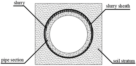 Currently, many scholars have conducted extensive research on grouting for friction reduction in pipe jacking. In terms of the slurry materials and interaction between slurry and soil, Wei et al. [5] and Namli and Guler [6] analyzed the properties of a thixotropic slurry, the grouting mechanism, and the use of a bentonite slurry to reduce the jacking resistance. Huang et al. [7] conducted experiments showing that the slurry can reduce the friction resistance in saturated sandy soil to 63.1%. Yu et al. [8] analyzed the relationship between the microscopic structure of slurry and friction resistance through laboratory tests, finding that friction resistance increases with time.