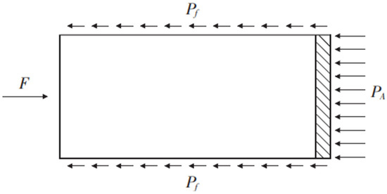 During the pipe jacking processes, the axial loads primarily include the front resistance of the pipe and the frictional resistance between the pipe and the surrounding soil. The frictional resistance around the pipe is influenced by the soil characteristics, contact conditions, and properties of the grout, which are reflected by the interface friction angle. The forces acting on the pipe are illustrated in Figure 2.