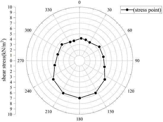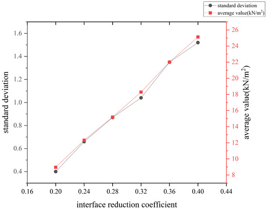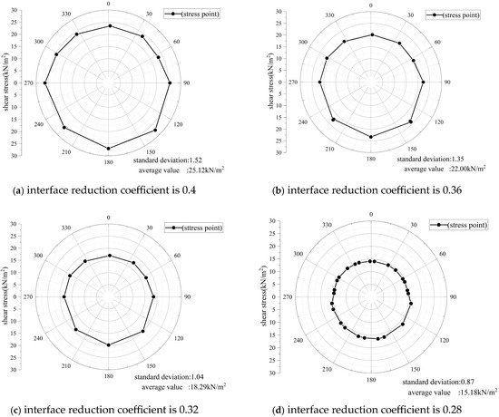 Figure 8 shows the distribution of sectional frictional resistance at the same position (100 m from the launch shaft) under different interface reduction coefficients. Figure 9 illustrates the variation in the standard deviation and average value with respect to different interface reduction coefficients. It can be observed that as the coefficient increases in the range of 0.2 to 0.4, the average frictional resistance around the pipe increases approximately linearly, and the value of the standard deviation of the stress points around the pipe also increases linearly. This reveals that as the interface reduction coefficient increases, the distribution of the stress around the pipe becomes more uneven. Thus, if the interface friction angle is sufficiently large, the variation in shear stress across the same section should be considered.