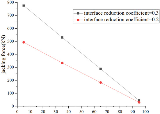 Figure 10 shows the axial jacking force along the length of the pipe under different interface reduction coefficients. It can be observed that as the distance from the launch shaft increases, the reduction in the jacking force slows down, indicating a slight decrease in the frictional resistance around the pipe. The reason may be the difference in displacement between the pipe and the surrounding soil. There should be sufficient relative distance to develop frictional resistance. Since the pipe is not modeled as rigid, the displacement near the launch shaft is greater than that at the pipe’s end, reducing the frictional resistance at the end.