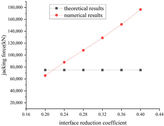 The theoretical and numerical results of the jacking force are summarized in Figure 11. Regarding the numerical results, as the interface friction angle increases, the total jacking force of the pipe increases approximately linearly. It can be inferred that in long-distance pipe jacking projects, the proportion of front resistance is very small, and the main resistance originates from the frictional resistance between the pipe and the surrounding soil.