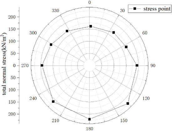 The theoretical method is presented in Section 2, indicating that the frictional resistance is 10 kN/m2, as shown in Table 1. The jacking force remains constant because the frictional resistance is defined as a fixed range. The different values can be applied within this range, but the value is too imprecise to select, so the fixed value is applied here. The simulated jacking force is much larger than the theoretical value because the theoretical value does not consider the increasing trend of frictional resistance with the depth of the pipe. In this simulation, the pipe’s bottom end is buried at a depth of 24.4 m, where the normal stress on the interface between the soil and the pipe is quite large, as shown in Figure 12 (100 m from the launch shaft). This results in significantly larger friction resistance around the pipe, much greater than the average friction resistance between the pipe and soil selected in the theoretical method as shown in Table 1.