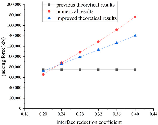 The previous theoretical results, improved theoretical results, and numerical results of the jacking force are summarized in Figure 13.