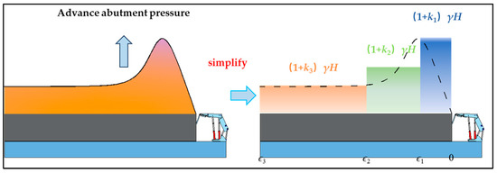 In the figure, x is the vertical distance from the roadway to the working face, m; y is the horizontal distance from the roadway to the working face, m; γ is the average specific gravity of overlying rock on the working face, kN/m3; q is the simplified function of the advanced abutment pressure in the coal seam of the working face, MPa; H is the burial depth of the working face, m; k1, k2, and k3 are the stress concentration coefficients; ϵ1, ϵ2, and ϵ3 are the range of action for each region, m.