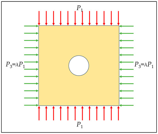 In the analysis of plane stress and strain problems in elasticity, compared to rectangular sections, the plane circular hole model is widely used due to its mature approximate analytical methods [23,24,25]. This method can accurately describe the stress distribution around the hole, providing theoretical support for engineering design. Therefore, this paper follows the plane circular hole mechanics model [26,27,28]. The plane circular hole mechanics model is shown in Figure 2.