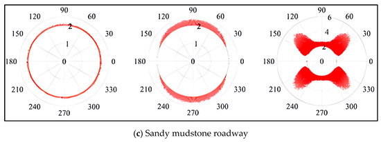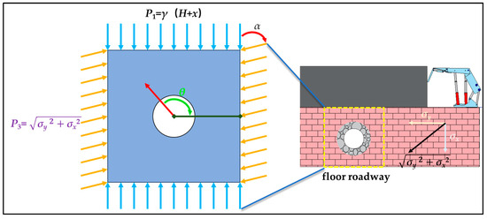 During the mining process of the working face, the direction of the mining-induced abutment pressure formed in the roof rock strata of the roadway is not absolutely vertical but inclines to a certain extent, which makes the internal stress distribution of the surrounding rock of the mining roadway present an asymmetric form and further causes the asymmetric failure of the surrounding rock of the roadway. Moreover, as the mining distance of the working face increases, the failure mode of the surrounding rock of the roadway tends to be complex [30,31]. Taking the circular roadway as the research object, let the radial stress, tangential stress, and shearing stress of the surrounding rock of the roadway be σr, σθ and τrθ, respectively. The expression of the stress components of the surrounding rock of the roadway is as in Equation (6):