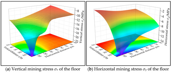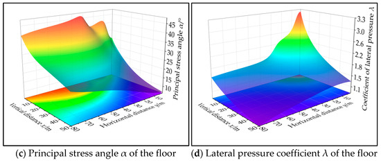Substituting the relevant parameters, the three-dimensional surfaces of the vertical mining-induced stress σx of the working face floor, the horizontal mining-induced stress σy of the floor, the angle of the principal stress α, and the lateral pressure coefficient λ of the floor are plotted as shown in Figure 4.