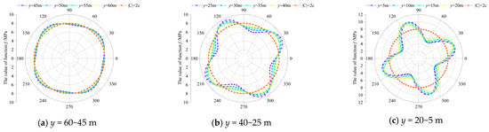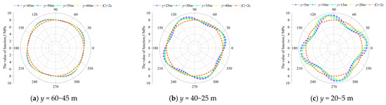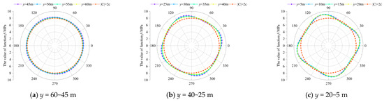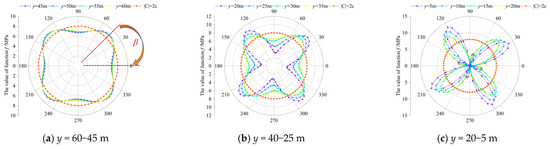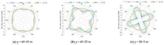 - As the horizontal distance y decreases, the criterion f of the surrounding rock of the roadway transitions from “circular” through “rectangular” and finally transforms into “butterfly-like”. Especially, when x = 5 m, the equation f is distributed in an “X-shaped” form, and as the distance between the working face and the roadway (x, y) decreases, the differences between the equations f gradually become prominent, indicating that as the distance between the roadway and the working face (x, y) decreases, the differences in the distribution of the plastic zone of the surrounding rock of the roadway at different spatial positions gradually become obvious;