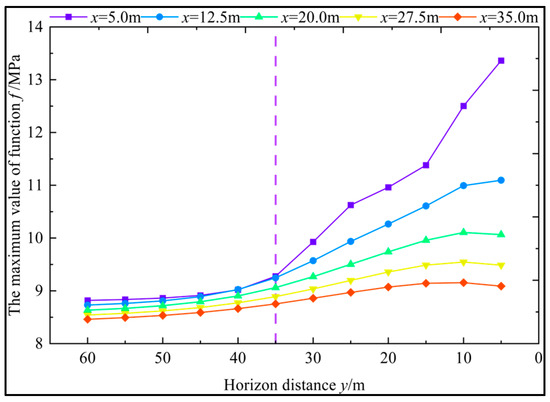 ① When 35 m ≤ y ≤ 60 m, the maximum values of equation f corresponding to different vertical distances x (ranging from 5 m to 35 m) all fall within the range of 8.5 MPa to 9.0 MPa, and their growth rate is relatively low, with an average growth rate of approximately 0.02 MPa/m. No significant change occurs for β, and its average decrease rate is approximately 0.08°/m;