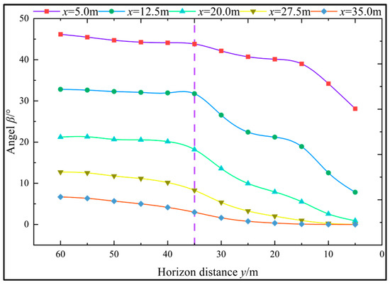 - β rotates counterclockwise as the horizontal distance y reduces, and the larger the vertical distance x is, the slower the rotation speed of β is. This indicates that as the vertical distance between the roadway and the working face increases, the angular velocity of the deflection of the plastic zone of the surrounding rock of the roadway decreases.
