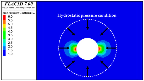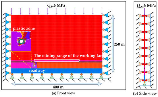 - Stress boundary conditions: in this study, it is assumed that the original stress environment of the roadway is in a “hydrostatic pressure” state. Therefore, the lateral pressure coefficient “stresses-ratio” is set to 1.0 to simulate the stress distribution of the surrounding rock of the roadway under hydrostatic pressure conditions (as shown in Figure 13, the red zone indicates that the element at this location is in the “hydrostatic pressure” state). At the upper boundary of the model, a uniform load Qz = 6 MPa equivalent to the load of the overlying strata is applied, and the normal velocities Vn = 0 m/s of all boundaries of the model are fixed to simulate the initial geostress balance under actual geological conditions;