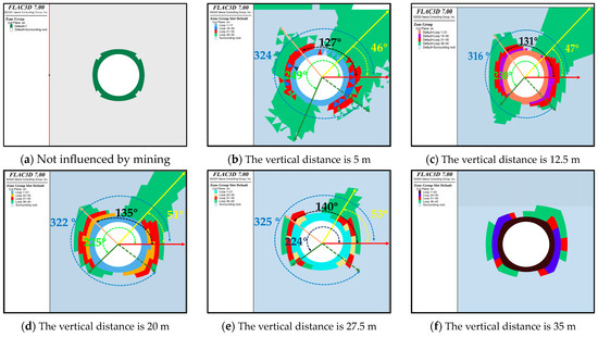 - Cyclic mining: after the initial geostress balance, the “loop” looping statement was used to simulate the coal seam mining process. The single-cycle mining length of the coal seam was 5 m, and the total mining length was 200 m. During the excavation, the built-in Fish language was employed to group the plasticity of the surrounding rock of the roadway at different loop stages to analyze the influence of the working face mining on the surrounding rock of the underlying roadway (as shown in Figure 14).
