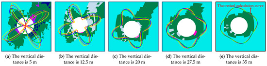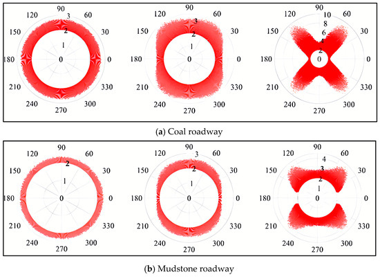 According to Figure 15 and Figure 16, it is evident that as the advancement distance of the working face increases, the shape of the plastic zone of the roadway surrounding rock exhibits a tendency to transform from the initial circular shape to a butterfly shape. Moreover, as the vertical distance between the roadway and the working face reduces, this trend becomes more pronounced. When the vertical distance between the roadway and the working face decreases to 5 m and 12.5 m, the final developed shape of the plastic zone gradually evolves into an X shape. This changing trend is essentially in accordance with the results obtained from numerical simulation.