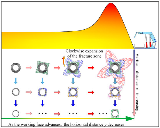 In the figure, when the development form of the plastic zone of the surrounding rock of the roadway is “circular”, it is in the “uninfluenced stage”; when the development form of the plastic zone of the roadway is “rectangular”, it is in the first stage; when the development form of the plastic zone of the roadway is “butterfly-shaped”, it is in the second stage.