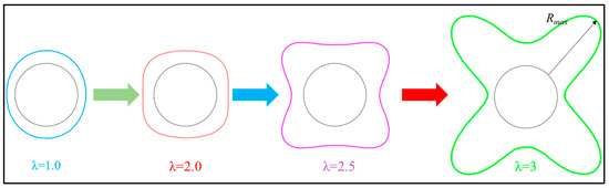 Li et al. [34] mainly concentrated on the research of plastic zones in homogeneous and heterogeneous roadway surrounding rocks. The research results indicated that with the increase in the lateral pressure coefficient, the shape of the plastic zone in homogeneous roadway surrounding rocks presented a change pattern of “circular—elliptical—butterfly-shaped”. This pattern implies that there might be a similar trend change in the shape of the plastic zone in homogeneous roadway surrounding rocks under the variation of the lateral pressure coefficient. The plastic zones of the single-layer homogeneous roadway surrounding rocks in different lateral pressure coefficient roadways are shown in Figure 19 [34].