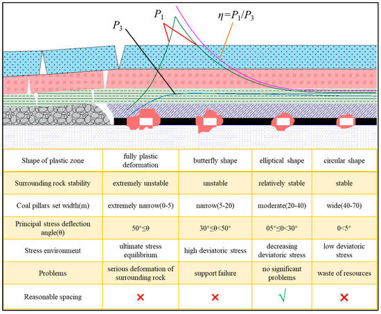 Gao et al. [35], taking the working face auxiliary retracement channel as the research object, indicated that in the non-uniform stress field, with the increase in the ratio η of the maximum principal stress P1 to the minimum principal stress P3 in the deviatoric stress environment, the shape of the plastic zone of the roadway surrounding rock develops as “circular—elliptical—butterfly-shaped”. When η = 1, the roadway is in a bidirectional equal stress state, and the plastic zone is a regular circular shape. When η increases, the plastic zone first develops from a circular shape to an elliptical one (the long axis of the ellipse is in the direction of P3). When η > 1.8, the growth rate of the plastic zone at the four corners of the roadway is greater than that at the two sides, and the shape develops from an elliptical one to a butterfly-shaped one. When η > 2.3, the shape is butterfly-shaped and a slight increase in η will significantly expand the plastic zone near the parallel direction angles of P1 and P3. The article further expounds the non-uniformity of the distribution of butterfly-shaped plastic zones in the roadway. Such a non-uniform distribution is prone to cause severe asymmetric deformation of the surrounding rock, thereby resulting in an unstable state. Under the influence of concentrated stress and deviatoric stress, the expansion of the butterfly-shaped plastic zone above the roof increases remarkably, and the range of the plastic zone exceeds the effective support range of the anchor bolts and anchor cables. This may cause the failure of the support structure, an increase in the subsidence of the roof, and even roof caving accidents. By contrast, the distribution of the elliptical plastic zone is more uniform, and its maximum depth is also decreased, enabling anchor bolts and anchor cables to offer more effective support and thereby keeping the roadway relatively stable. Meanwhile, the circular plastic zone is hardly influenced by mining activities, and its plastic zone range is the smallest; thus, the stability of the surrounding rock is the best. The determination of the reasonable spacing of the auxiliary retracement channel is as shown in Figure 20 [35].