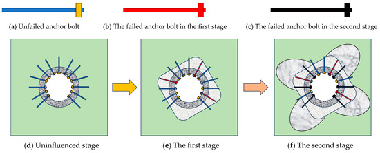 - Design and enhancement of roadway support schemes: through comprehending the butterfly-shaped failure mechanism, engineers can predict the failure mode and location of the roadway surrounding rock with greater precision, infer the failure areas of support elements (such as anchor bolts, anchor cables, etc.), and thereby devise more effective support schemes. Moreover, differentiated support approaches can be employed for distinct regions (such as the butterfly leaf zone and non-butterfly leaf zone) to enhance the targeting and efficacy of the support and reduce roadway deformation and failure resulting from improper support. The stage-by-stage instability of the anchor bolts in the “butterfly” plastic zone of the roadway is as shown in Figure 21;