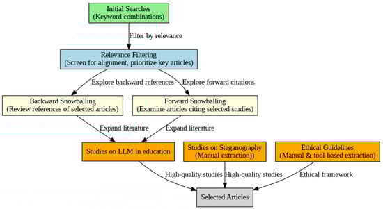 The review was then divided into three specialized areas: studies on large language models (LLMs) in education; studies on steganography, both focusing on high-quality, highly cited works; and ethical guidelines, extracted through manual review and tools such as Perplexity. The final output—the selected articles—formed a robust foundation for analyzing LLM applications in computer science education.