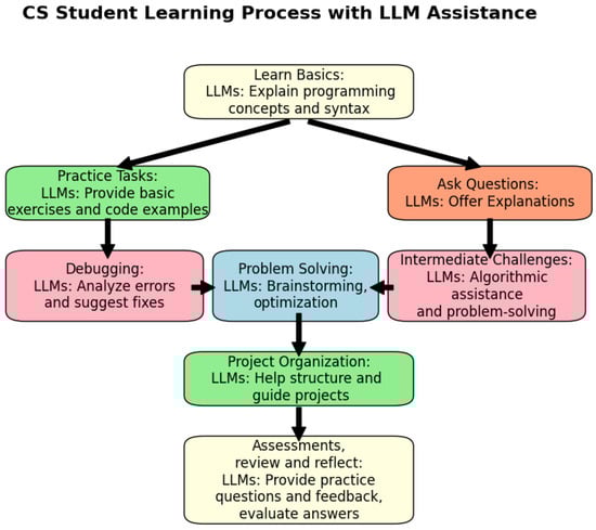 Figure 4 illustrates the primary steps undertaken by computer science students to enhance and practice their programming abilities, alongside the assistance that LLMs can provide at each stage.
