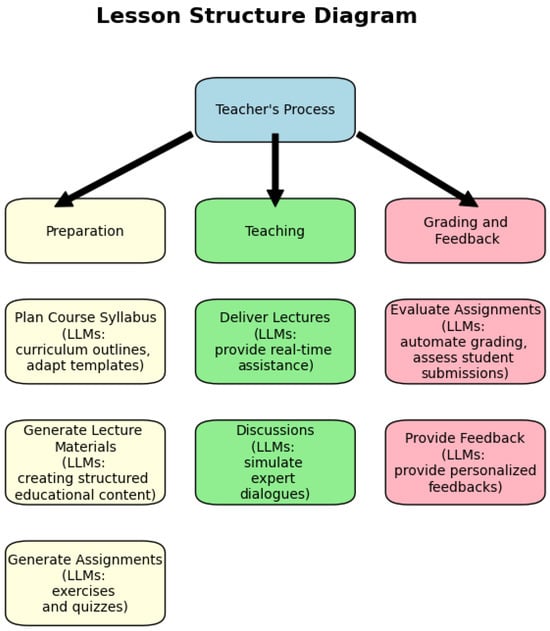 In the realm of education, LLMs extend their utility beyond student assistance. They are also transforming how educators prepare lectures, develop learning materials, and assess student levels. Large language models have shown significant potential to advance classroom teaching through generating creative and meaningful teacher–student interactions, automating lesson planning, and providing real-time feedback. This section reviews several studies that highlight how LLMs can support educators not only in content delivery, but also in enhancing their overall teaching effectiveness. Through integrating these AI-driven tools, teachers can maintain a high standard of education while also harnessing the benefits of technology to support their instructional strategies.
