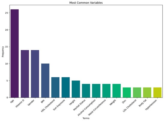 A literature review was carried out to identify the variables most used in training ML algorithms for predicting vitamin D factor risk in detail. In Figure 2, we can observe that the most frequently used underlining variables across the reviewed studies used by data sciences were age, vitamin D levels, gender, and body mass index (BMI), indicating their importance in the analysis of vitamin D levels and related health outcomes. Additionally, other factors such as high-density lipoprotein, cholesterol, and sun exposure also appeared regularly. Understanding which variables were most analyzed helps us replicate those conditions in our datasets and evaluate how consistent the results might be.