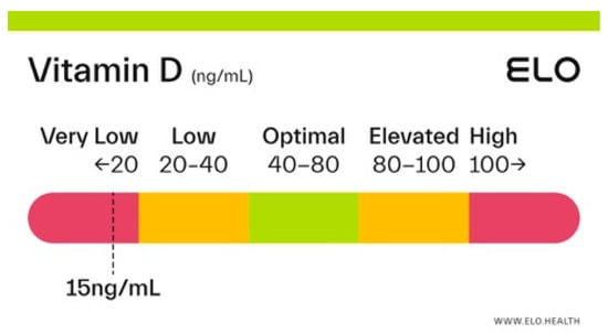 Vitamin D molecule levels, Penner E, MPH, vitamin D: 15 ng/mL; https://www.elo.health/biomarkers/vitamin-d-overview/15/. Accessed on 20 May 2024.