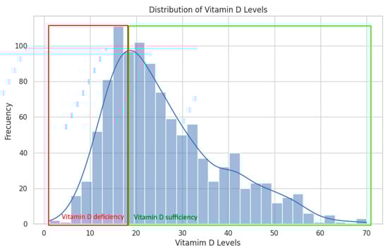 A threshold was also used to classify vitamin D levels into two categories: deficiency and sufficiency. A binary classification was established following medical criteria: (i) Class 0 (deficiency): vitamin D levels below 15 ng/mL. (ii) Class 1 (sufficiency): vitamin D levels above 15 ng/mL. See Figure 3.