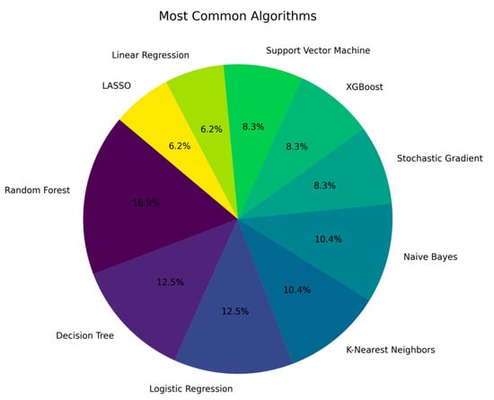 Likewise, an exhaustive literature review [30,31,32,33,34,35,36,37,38,39,40,41,42] was conducted on the most useful ML models trained by data scientists to predict risk factors and low vitamin D levels based on clinical data associated with this pathology, looking to decrease the morbidity rate due to other diseases caused by this deficit. Figure 5 shows the distribution of ML algorithms most useful. Random Forest is the most relevant algorithm, with 16.7% of a total of 200 articles, followed by Logistic Regression and Decision Tree, with 12.5%, and SVM, with 8.3%, which also stands out as a frequently used method.