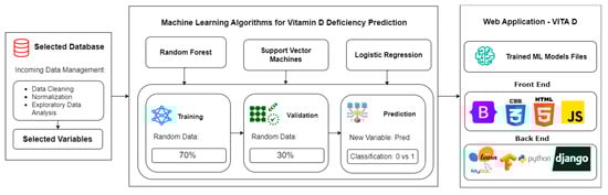 Background: Vitamin D deficiency is a significant risk factor for several chronic conditions. This study aims to predict vitamin D deficiency levels in a private database, collected from the southern part of Loja-Ecuador using a graphical web interface tool based on artificial intelligence algorithms. Methods: Two databases were processed using ML training models: SVM, Random Forest (RF), Linear Regression (LR). (i) Private data collection was undertaken on 465 patients from a local university, where vitamin D levels were measured through a blood sample collection to calculate the concentration of 25-hydroxy vitamin D in plasma and determine it by enzyme-linked immunosorbent assay, and (ii) public data collection was obtained from the FigShare database. Then, a survey was conducted from April 2022 to June 2023, identifying 157 variables, 18 of which were used for ML training models. Results: Vitamin D deficiency levels in private patients reached 18.10 ng/mL and 20.42 ng/mL in the public. The RF algorithm achieved (87.73%) accuracy, the SVM (80.0%), and LR (70.70%). RF was selected as the best performance model for web application design in binary levels classification: deficiency (Class 0) indicates vitamin D levels below 15 ng/mL, and sufficiency (Class 1) indicates vitamin D levels above 15 ng/mL. Conclusions: The “VITA-D” web application was used to monitor and predict vitamin D levels and deficiency factor risk based on clinical and sociodemographic data, providing an efficient and cost-effective alternative to traditional vitamin D testing methods.