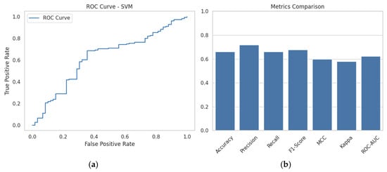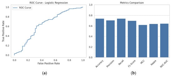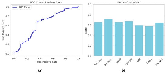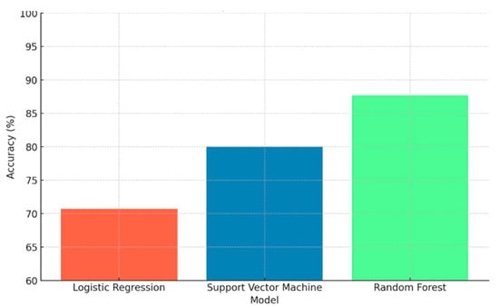 Based on the previous results in this research, three ML models for clinical data analysis were selected: SVM, Random Forest, and Logistic Regression, and similar results were obtained in Figure 11, Figure 12 and Figure 13, demonstrating that the RF algorithm achieved higher accuracy (87.73%) in classifying both classes concerning SVM (80.0%) and LR (70.70%).