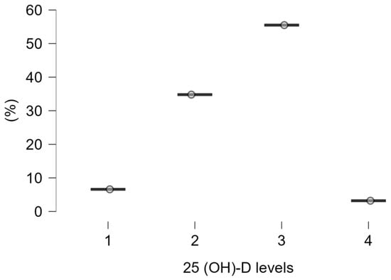 Figure 4 presents the distribution of vitamin D levels among the analyzed patients. A clear clustering of data around the 20 ng/mL threshold is observed in the graph. To facilitate visualization, a red color scheme represents vitamin D deficiency values (less than 18 ng/mL), while green is used for sufficiency values (greater than or equal to 18 ng/mL). The ranges are visually highlighted with colored boxes and vertical lines corresponding to the defined thresholds.